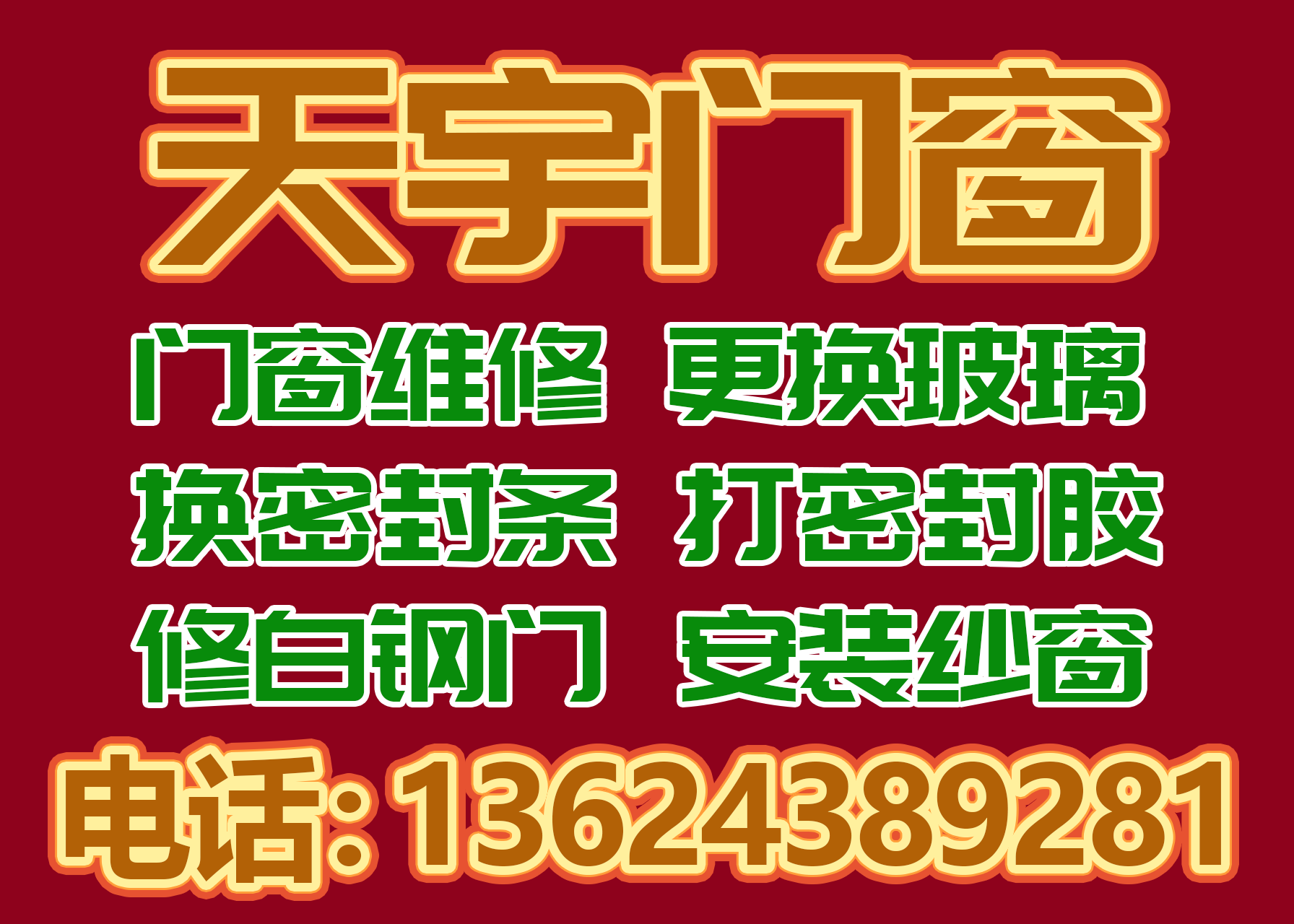 松原天宇铝塑门窗厂,是一家二十余年的老厂《专业制作维修各种门窗》防盗门改通风口,专业门窗维修,塑钢窗维修,断桥铝门窗维修,系统窗维修,修理门窗,修门,修白钢门,修防盗门,修拉门,修推拉门,修折叠门,修塑钢窗,修塑钢门,修窗户,维修各种门窗,维修门窗漏风,漏雨,窗户关不严,更换门窗密封胶条,把手,合页,传动器,锁点,更换门地弹簧,闭门器,门拉手,更换拉门滑轮,滑道,各种门窗五金配件,为您解决各种门窗疑难杂症。换玻璃,换门玻璃,换窗户玻璃,更换钢化玻璃,换各种门窗玻璃,玻璃割圆。专业打胶,打美缝胶,打密封胶,打窗内外防水胶,防尘胶,防寒胶 。定做纱窗,纱窗,纱门,金刚网纱窗,金刚网纱门,护栏,防护栏,儿童防护栏,防盗窗,防盗网。安装罗马杆,窗帘盒,单滑道,双滑道,晾衣架,卷帘窗,百叶窗,包门,软包门,软包防盗门。定做菜筐,阳台菜筐,白钢菜筐,铁艺菜筐。我们的团队宗旨是服务至上,信誉好《江南江北,松原周边,均可上门服务》《欢迎来电咨询洽谈》